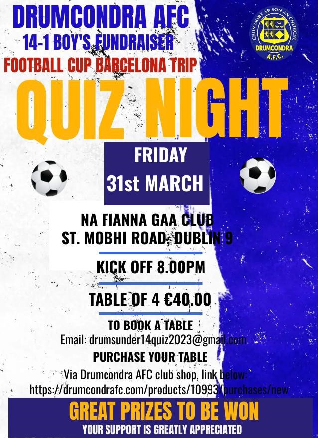 Drumcondra AFC under 14 team fundraiser for FC Barcelona competition. Quiz night in Na Fianna - St Mobhi Road 31/03/2023